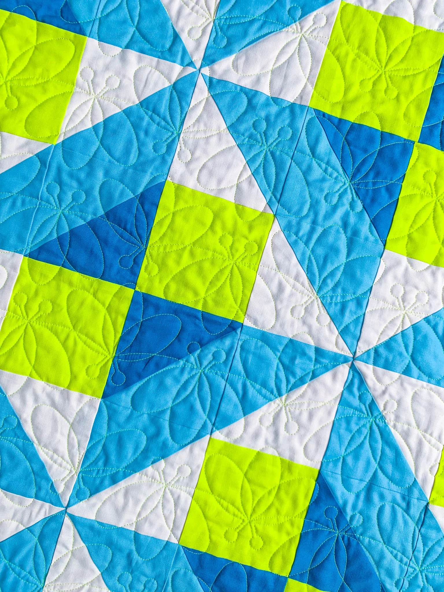 The fabrics in the lap sample quilt are Kona Cotton Solids in Shell, Seascape, Oasis, and Acid Lime. It was pieced by Christine Boyd, quilted by Lilo Whitener-Fey / Trace Creek Quilting using neon yellow thread, and bound by me. The quilting pantograph is Firefly by Crystal Smythe, and the backing is Domino Dot in Seascape by Violet Craft.