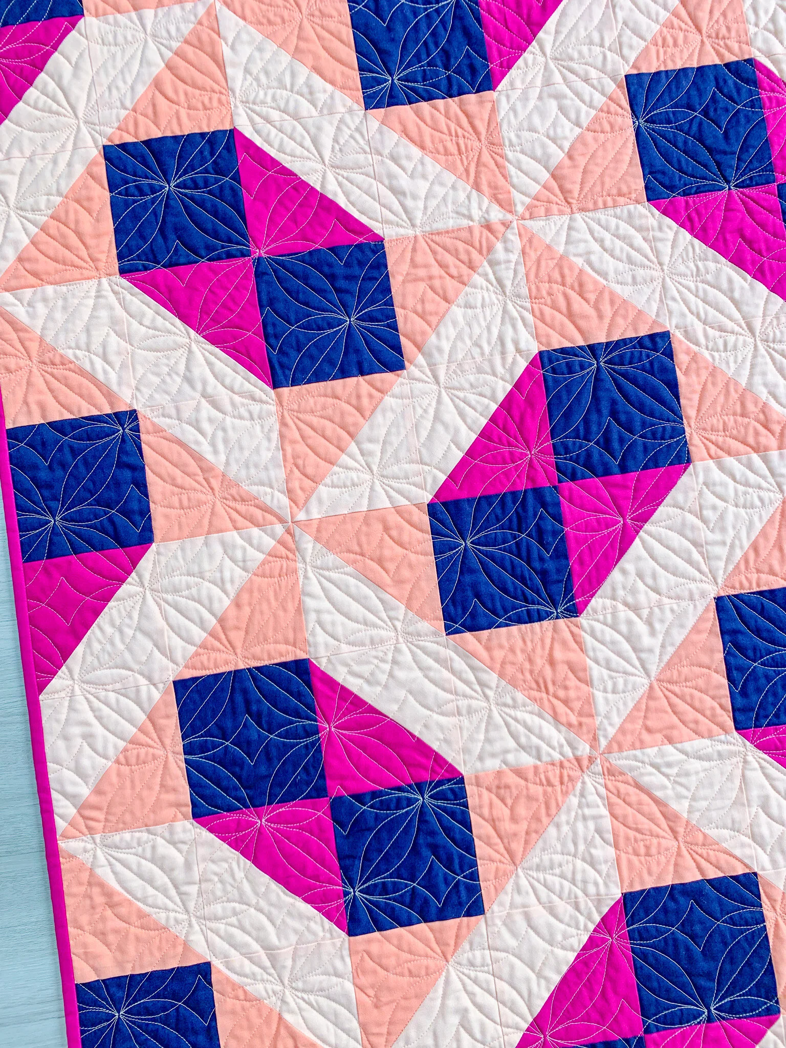 The cover quilt is the Throw size. The fabrics in the cover quilt are Kona Cotton Solids in Cerise, Creamsicle, Ice Peach, and Nautical. It was pieced and bound by me and quilted by Lilo Whitener-Fey / Trace Creek Quilting using a pale peach thread. The quilting pantograph is Twinkle Toes by Karlee Porter, and the backing is Paintbox Diamonds in Peach by Elizabeth Hartman.